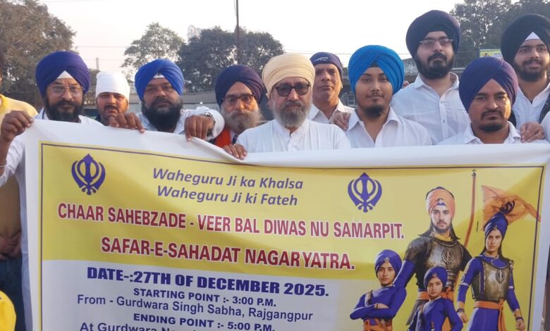 рд░рд╛рдЬрдЧрд╛рдВрдЧрдкреБрд░, 27 рджрд┐рд╕рдореНрдмрд░ 2025 рдзрд░реНрдо рдПрд╡рдВ рд╕рдВрд╕реНрдХреГрддрд┐ рдХреА рд░рдХреНрд╖рд╛ рд╣реЗрддреБ рдЕрдкрдиреЗ рд╕рд░реНрд╡реЛрдЪреНрдЪ рдмрд▓рд┐рджрд╛рди рджреЗрдиреЗ рд╡рд╛рд▓реЗ рд╢реНрд░реА рдЧреБрд░реБ рдЧреЛрдмрд┐рдВрдж рд╕рд┐рдВрд╣ рдЬреА рдХреЗ рдЪрд╛рд░ рд╕рд╛рд╣рд┐рдмрдЬрд╛рджреЛрдВ рдХреА рд╢рд╣рд╛рджрдд рдХреЛ рдирдорди рдХрд░рддреЗ рд╣реБрдП рдЖрдЬ рд░рд╛рдЬрдЧрд╛рдВрдЧрдкреБрд░ рд╢рд╣рд░ рдХреЗ рдУрд╕реАрдПрд▓ рдорд╛рд░реНрдХреЗрдЯ рдЧреБрд░реБрд╕рд┐рдВрд╣ рд╕рднрд╛ рдЧреБрд░реБрджреНрд╡рд╛рд░рд╛ рдХрдореЗрдЯреА рдХреЗ рдмреИрдирд░ рддрд▓реЗ рд╡реАрд░ рдмрд╛рд▓ рджрд┐рд╡рд╕ рдХреЗ рдЕрд╡рд╕рд░ рдкрд░ рдЧрд░рд┐рдорд╛рдордп рд╡рд╛рддрд╛рд╡рд░рдг рдореЗрдВ рдЕрдкрд░рд╛рд╣реНрди 3:30 рдмрдЬреЗ рдПрдХ рд╢реЛрднрд╛ рдпрд╛рддреНрд░рд╛ рдирд┐рдХрд▓реА рдЧрдИред