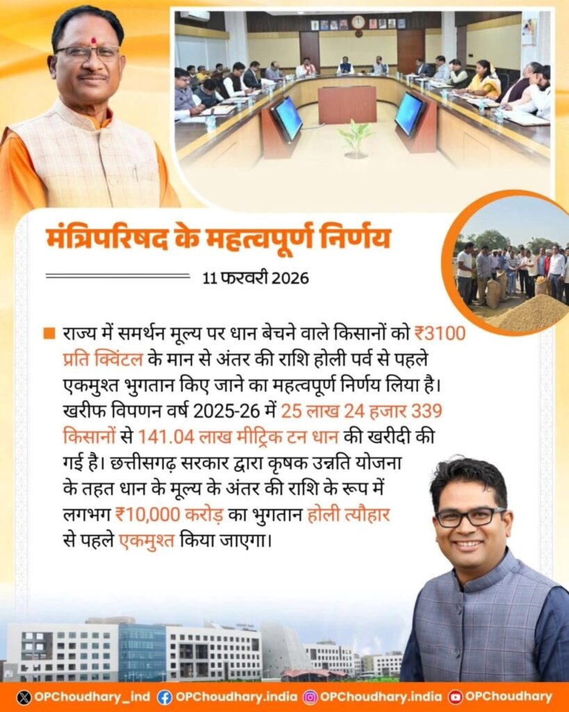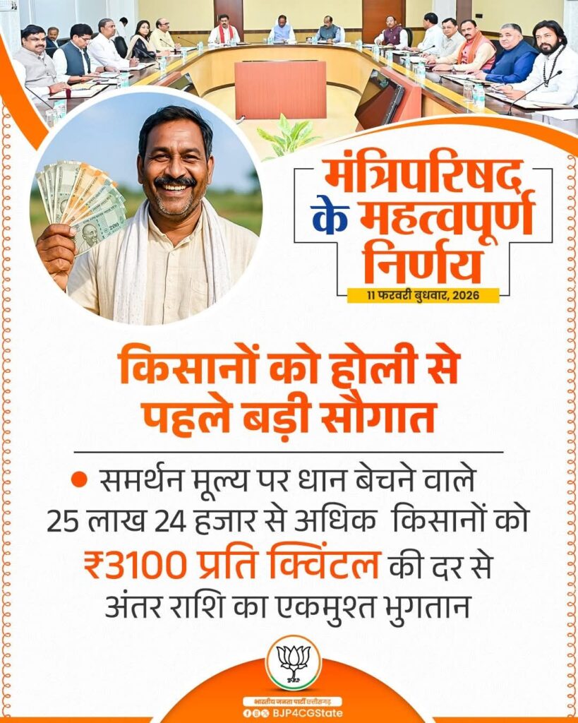 ЁЯСЙрд░рд╛рдпрдкреБрд░ рдореБрдЦреНрдпрдордВрддреНрд░реА рд╢реНрд░реА рд╡рд┐рд╖реНрдгреБ рджреЗрд╡ рд╕рд╛рдп рдХреА рдЕрдзреНрдпрдХреНрд╖рддрд╛ рдореЗрдВ рдордВрддреНрд░рд╛рд▓рдп рдорд╣рд╛рдирджреА рднрд╡рди рдореЗрдВ рдЖрдпреЛрдЬрд┐рдд рдордВрддреНрд░рд┐рдкрд░рд┐рд╖рдж рдХреА рдмреИрдардХ рдореЗрдВ рд╕рдорд░реНрдерди рдореВрд▓реНрдп рдкрд░ рдзрд╛рди рдмреЗрдЪрдиреЗ рд╡рд╛рд▓реЗ рдХрд┐рд╕рд╛рдиреЛрдВ рдХреЛ тВ╣3100 рдкреНрд░рддрд┐ рдХреНрд╡рд┐рдВрдЯрд▓ рдХреЗ рдорд╛рди рд╕реЗ рдЕрдВрддрд░ рдХреА рд░рд╛рд╢рд┐ рд╣реЛрд▓реА рдкрд░реНрд╡ рд╕реЗ рдкреВрд░реНрд╡ рдПрдХрдореБрд╢реНрдд рджреЗрдиреЗ рдХреЗ рдирд┐рд░реНрдгрдп рдХрд╛ рднрд╛рдЬрдкрд╛ рдХрд┐рд╕рд╛рди рдореЛрд░реНрдЪрд╛ рдиреЗ рд╕реНрд╡рд╛рдЧрдд рдХрд┐рдпрд╛ рд╣реИредЁЯСЗ