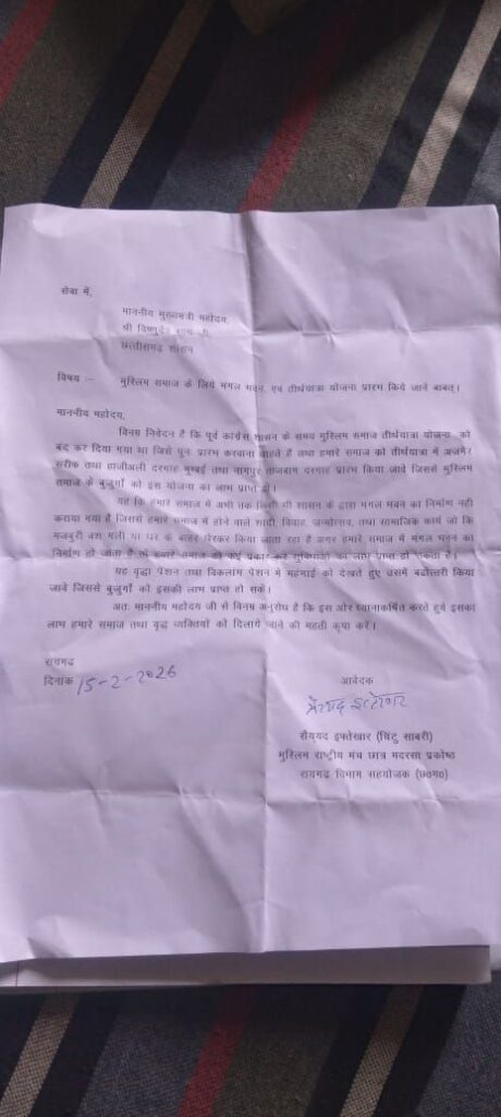 рд░рд╛рдпрдЧрдврд╝- рдореБрд╕реНрд▓рд┐рдо рд╕рдорд╛рдЬ рдХреЗ рд▓реЛрдЧреЛрдВ рдХреЛ рддреАрд░реНрде рдпрд╛рддреНрд░рд╛ рдореЗрдВ рд▓реЗ рдЬрд╛рдиреЗ рдХреЗ рд▓рд┐рдП рд╡ рдореБрд╕реНрд▓рд┐рдо рд╕рдорд╛рдЬ рднрд╡рди / рдкрд┐рдЫрд▓реЗ рдХрд╛рдВрдЧреНрд░реЗрд╕ рдХрд╛рд░реНрдпрдХрд╛рд▓ рд╕реЗ рдмреБрдЬреБрд░реНрдЧреЛрдВ рдХреЛ рдЕрдЬрдореЗрд░ рд╢рд░реАрдл рд▓реЗ рдЬрд╛рдпрд╛ рдЬрд╛рддрд╛ рдерд╛ рдЬреЛ рдХрд┐ рдмрдВрдж рдХрд░ рджрд┐рдпрд╛ рдЧрдпрд╛ рд╣реИ рдЗрд╕реА рд╡рд┐рд╖рдп рдХреЛ рд▓реЗрдХрд░ рдЖрдЬ рдореБрд╕реНрд▓рд┐рдо рд░рд╛рд╖реНрдЯреНрд░реАрдп рдордВрдЪ рдЫрд╛рддреНрд░ рд╡ рдорджрд░рд╕рд╛ рдкреНрд░рдХреЛрд╖реНрда рдХреЗ рд░рд╛рдпрдЧрдврд╝ рд╡рд┐рднрд╛рдЧ рд╕рдВрдпреЛрдЬрдХ рд╕реИрдпреЯрдж рдЗрдлреНрддреЗрдЦрд╛рд░ ( рдЪрд┐рдВрдЯреВ рд╕рд╛рдмрд░реА ) рдЕрдЬрдореЗрд░ рд╢рд░реАрдл . рдирд╛рдЧрдкреБрд░ рддрд╛рдЬрдмрд╛рдЧ . рд╣рд╛рдЬреА рдЕрд▓реА рджрд░рдЧрд╛рд╣ рдореБрдВрдмрдИ . рддреАрд░реНрде рдпрд╛рддреНрд░рд╛ рдЪрд╛рд▓реВ рдХрд░рдиреЗ рдХреЗ рд▓рд┐рдП рдЖрд╡реЗрджрди рджрд┐рдП рдФрд░ рдореБрд╕реНрд▓рд┐рдо рд╕рдорд╛рдЬ рдореЗрдВ рдПрдХ рдмрдбрд╝реЗ рднрд╡рди рдХрднреА рдорд╛рдВрдЧ рдХрд┐рдпрд╛ рдЧрдпрд╛ рд░рд╛рдпрдЧрдврд╝ рдореЗрдВ рдПрдХ рднреА рд╕рд╛рдорд╛рдЬрд┐рдХ рд╢рд╛рджреА рдмрд┐рд╣рд╛рд░ рдХрд╛ рдореБрд╕реНрд▓рд┐рдо рд╕рдорд╛рдЬ рдХрд╛ рднрд╡рди рдирд╣реАрдВ рдЗрд╕ рд╡рд┐рд╖рдп рдкрд░ рд╕реАрдПрдо рд╕рд╛рд╣рдм рдЕрд╡рдЧрдд рдХрд░рд╛рдпрд╛ рдЧрдпрд╛ рдФрд░ рдЗрд╕реА рдХрдбрд╝реА рдореЗрдВ рд╕рднреА рд╕рдорд╛рдЬ рдХреЗ рдмреБрдЬреБрд░реНрдЧ . рдФрд░ рд╡рд┐рдХрд▓рд╛рдВрдЧ . рдкреЗрдВрд╢рди рдореЗрдВ рдмрдврд╝реЛрддрд░реА рдХреЗ рд▓рд┐рдП рднреА рдЪрд░реНрдЪрд╛ рд╣реБрдИ рдореБрд╕реНрд▓рд┐рдо рд░рд╛рд╖реНрдЯреНрд░реАрдп рдордВрдЪ рдпрд╣ рдПрдХ рдРрд╕рд╛ рд╕рдВрдЧрдарди рд╣реИ рдЬреЛ рд░рд╛рд╖реНрдЯреНрд░рд╡рд╛рджреА рд╡рд┐рдЪрд╛рд░рдзрд╛рд░рд╛ рдкрд░ рдХрд╛рд░реНрдп рдХрд░рддрд╛ рд╣реИ рдЬрдп рд╣рд┐рдВрдж рд╡рдВрджреЗ рдорд╛рддрд░рдо рднрд╛рд░рдд рдорд╛рддрд╛ рдХреА рдЬрдп