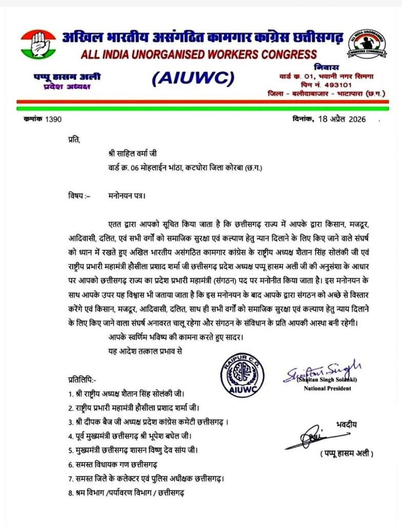 ЁЯТердХрд╛рдВрдЧреНрд░реЗрд╕ рдиреЗрддрд╛ рд╕рд╛рд╣рд┐рд▓ рд╡рд░реНрдорд╛ рдХреЛ рдЕрдЦрд┐рд▓ рднрд╛рд░рддреАрдп рдЕрд╕рдВрдЧрдард┐рдд рдХрд╛рдордЧрд╛рд░ рдХрд╛рдВрдЧреНрд░реЗрд╕ рдХреЗ рдЫрддреНрддреАрд╕рдЧрдврд╝ рдкреНрд░рджреЗрд╢ рд╕рдВрдЧрдарди рдорд╣рд╛рдордВрддреНрд░реА рдмрдирд╛рдпреЗрдВ рдЧрдПЁЯТе