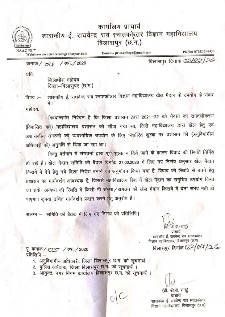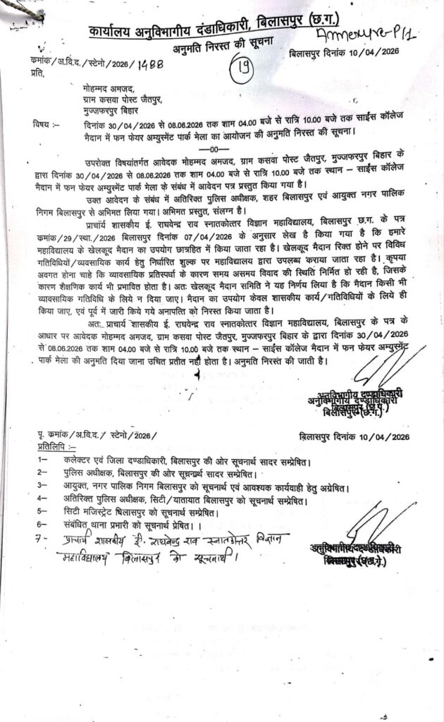 рдкреВрд░реНрд╡ рдЕрдиреБрдорддрд┐ рдХреЗ рдмрд╛рд╡рдЬреВрдж рдлрди рдлреЗрдпрд░ рдореЗрд▓рд╛ рд╣реБрдЖ рдирд┐рд░рд╕реНрдд : рдЗрд╕реА рдмреАрдЪ рдПрдХ рдмрдбрд╝реЗ рд╡реНрдпрд╛рд╡рд╕рд╛рдпрд┐рдХ рдЖрдпреЛрдЬрди рдлрди рдлреЗрдпрд░ рдЕрдореНрдпреВрдЬрдореЗрдВрдЯ рдкрд╛рд░реНрдХ рдореЗрд▓рд╛ рдХреА рдЕрдиреБрдорддрд┐ рдХреЗ рд▓рд┐рдП рдЖрд╡реЗрджрди рджрд┐рдпрд╛ рдЧрдпрд╛ рдерд╛ред рдкреНрд░рд╕реНрддрд╛рд╡ рдХреЗ рдЕрдиреБрд╕рд╛рд░ рдпрд╣ рдореЗрд▓рд╛ 30 рдЕрдкреНрд░реИрд▓ 2026 рд╕реЗ 8 рдЬреВрди 2026 рддрдХ, рдкреНрд░рддрд┐рджрд┐рди рд╢рд╛рдо 4 рдмрдЬреЗ рд╕реЗ рд░рд╛рдд 10 рдмрдЬреЗ рддрдХ рд╕рд╛рдЗрдВрд╕ рдХреЙрд▓реЗрдЬ рдореИрджрд╛рди рдореЗрдВ рдЖрдпреЛрдЬрд┐рдд рд╣реЛрдирд╛ рдерд╛ред рдЗрд╕рдореЗрдВ рдЭреВрд▓реЗ, рдордиреЛрд░рдВрдЬрди рдЧрддрд┐рд╡рд┐рдзрд┐рдпрд╛рдВ рдФрд░ рд╡реНрдпрд╛рд╡рд╕рд╛рдпрд┐рдХ рд╕реНрдЯреЙрд▓ рд▓рдЧрд╛рдП рдЬрд╛рдиреЗ рдереЗред рд▓реЗрдХрд┐рди рдкреНрд░рд╢рд╛рд╕рди рдиреЗ рд╕рднреА рдкрд╣рд▓реБрдУрдВ рдкрд░ рд╡рд┐рдЪрд╛рд░ рдХрд░рддреЗ рд╣реБрдП, рд╡рд┐рд╢реЗрд╖рдХрд░ рдЫрд╛рддреНрд░ рд╣рд┐рдд рдФрд░ рдЦреЗрд▓ рдЧрддрд┐рд╡рд┐рдзрд┐рдпреЛрдВ рдХреЛ рдкреНрд░рд╛рдердорд┐рдХрддрд╛ рджреЗрддреЗ рд╣реБрдП, рдЗрд╕ рдЖрдпреЛрдЬрди рдХреА рдЕрдиреБрдорддрд┐ рдирд┐рд░рд╕реНрдд рдХрд░ рджреАредрдЕрдиреБрднрд╛рдЧреАрдп рдЕрдзрд┐рдХрд╛рд░реА,рдмрд┐рд▓рд╛рд╕рдкреБрд░ рджреНрд╡рд╛рд░рд╛ рдЬрд╛рд░реА рдЖрджреЗрд╢ рдореЗрдВ рд╕реНрдкрд╖реНрдЯ рдХрд┐рдпрд╛ рдЧрдпрд╛ рдХрд┐ рдореИрджрд╛рди рдХрд╛ рдЙрдкрдпреЛрдЧ рдХреЗрд╡рд▓ рд╢реИрдХреНрд╖рдгрд┐рдХ рдФрд░ рдЦреЗрд▓ рдЧрддрд┐рд╡рд┐рдзрд┐рдпреЛрдВ рдХреЗ рд▓рд┐рдП рд╣реЛрдирд╛ рдЪрд╛рд╣рд┐рдП рдФрд░ рдХрд┐рд╕реА рднреА рдкреНрд░рдХрд╛рд░ рдХреЗ рд╡реНрдпрд╛рд╡рд╕рд╛рдпрд┐рдХ рдЖрдпреЛрдЬрди рдХреА рдЕрдиреБрдорддрд┐ рджреЗрдирд╛ рдЙрдЪрд┐рдд рдирд╣реАрдВ рд╣реИред